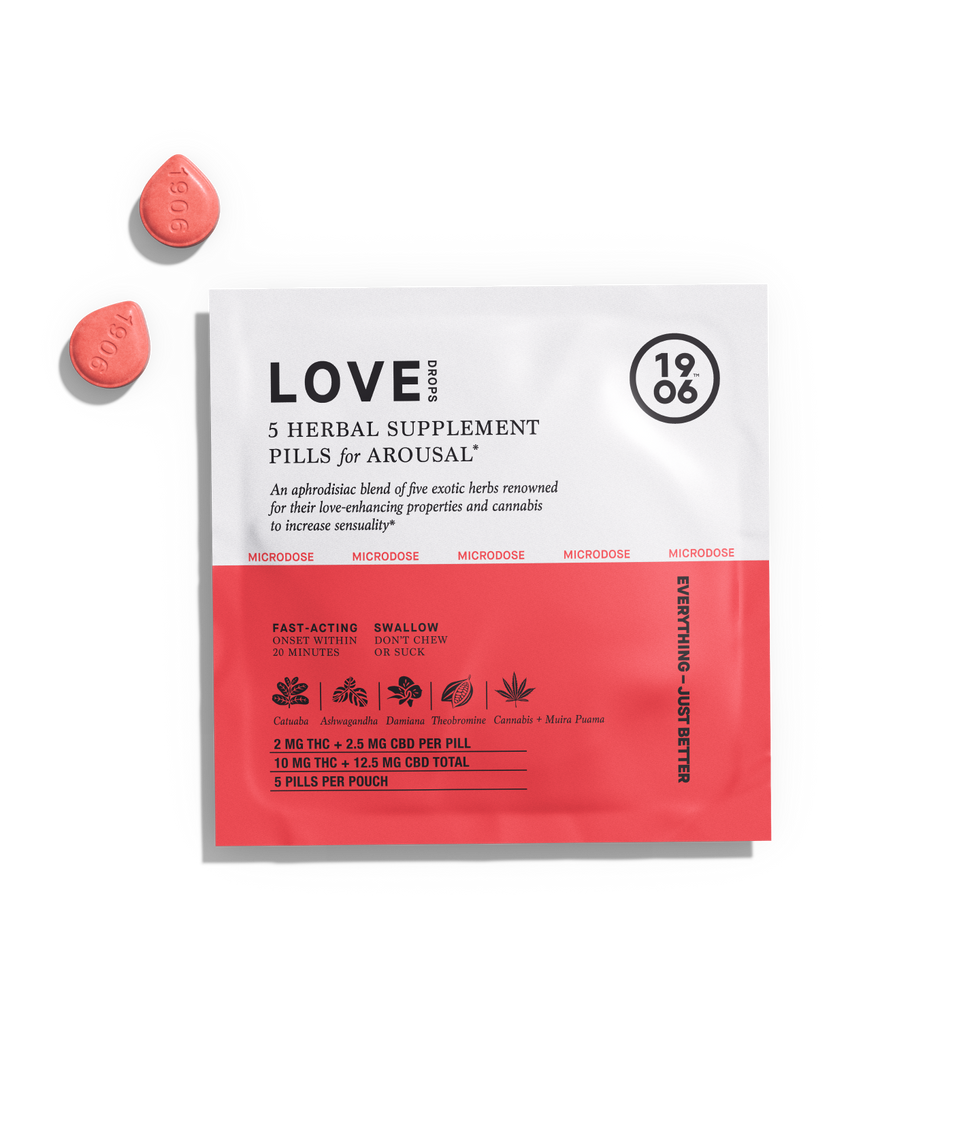 1906 Love Drops are an equal-opportunity aphrodisiac formulated to work on all genders. Containing 2.0 mg THC and 2.5 mg CBD per serving, Love Drops increase blood flow, boost lubrication, diminish inhibition, and improve sexual stamina, making them a great choice for extra special date nights, solo or partnered intimacy, and heart-opening exploration. Take one Drop as a micro-dose for a feel-good boost, or double up for a more intense experience. Love Drops are meant to be swallowed—do not chew.